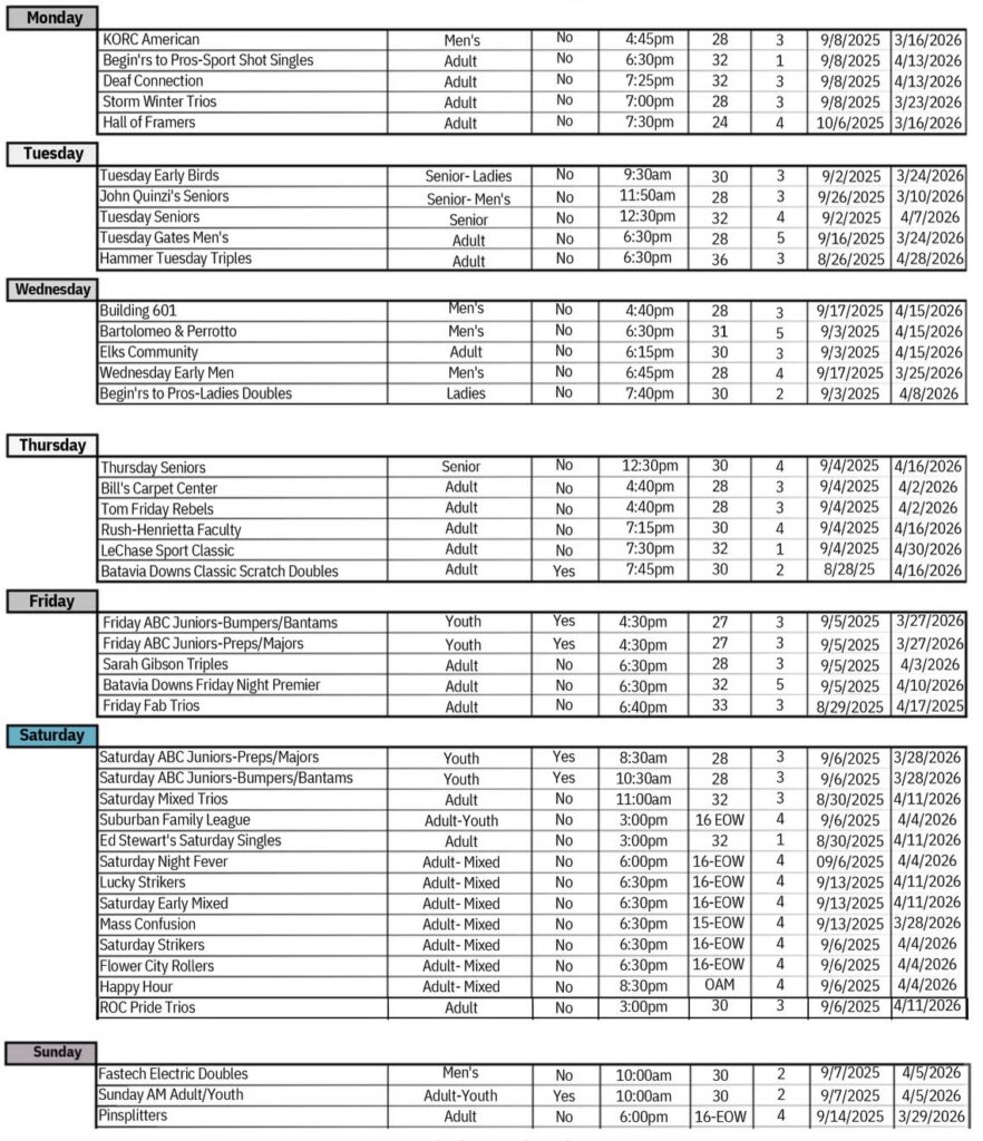 Flower City Rollers | Mixed | Sat | 6:30 PM | 4 | 7-Sep | 16 - EOW |